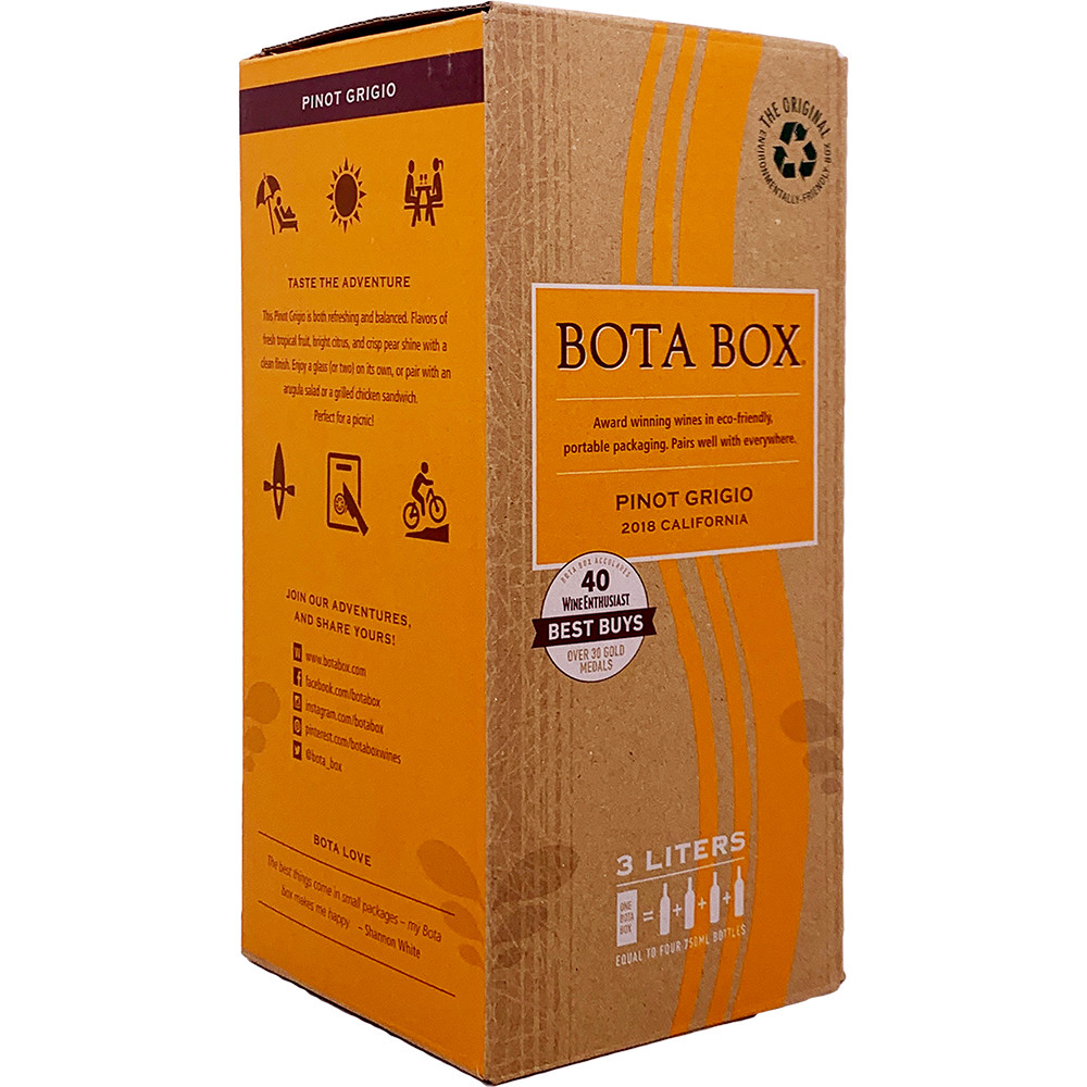 Bota Box Pinot Grigio (also known as "Bota Brick Pinot Grigio" & "Bota Mini Pinot Grigio") is fresh and fruity and delivers juicy, medium-bodied flavors of white peaches and citrus, with a clean, refreshing finish laced with pineapple and floral notes. Delicate floral, honeysuckle and nectarine aromas float up from the glass. Layers of white peach, nectarine, and tangerine form a luscious palate, while hints of minerality lead to an energizing finish. Light peach and apple aromas and crisp flavors make this medium-bodied wine lively and appetizing. It tastes nicely dry, clean, and fresh. Bota Box Pinot Grigio 2018 is a crisp, refreshing sipper. Its light, fruity character makes it the perfect aperitif. Bota Box Wine Pinot Grigio is perfect after a long afternoon hike or a long day at the office, or pairs well with no-fuss dinner entrees like pork stir-fry, grilled chicken salad or adult Mac n' Cheese with a spicy kick of chorizo. Serve chilled. Enjoy!