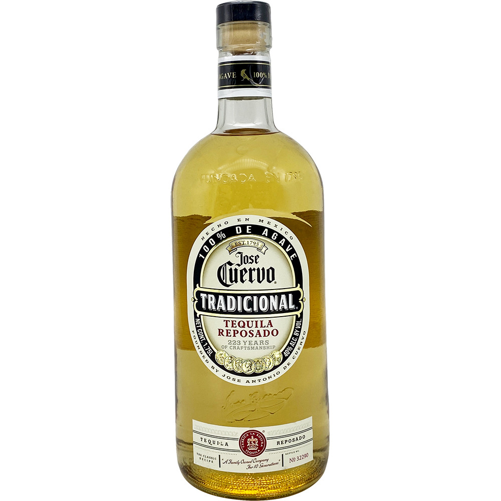 Jose Cuervo Tradicional Reposado Tequila is 100% blue agave rested tequila. It has been aged in oak barrels for a minimum of two months, giving it the smooth and subtle complexity that aficionados seek. Rested in white oak barrels, this legendary handcrafted 100% blue agave tequila is still made with the same traditional methods that Jose Cuervo used when he first began producing tequila in 1795. The Cuervo family continues to proudly seal each bottle with the symbol of their family name. Tradicional is the original Cuervo tequila, and it is still the number one premium tequila in Mexico. The essence of agave aroma, herbaceous, and light oak tones. Warm and spicy finish. Enjoy this authentic Reposado Tequila on the rocks or in your favorite